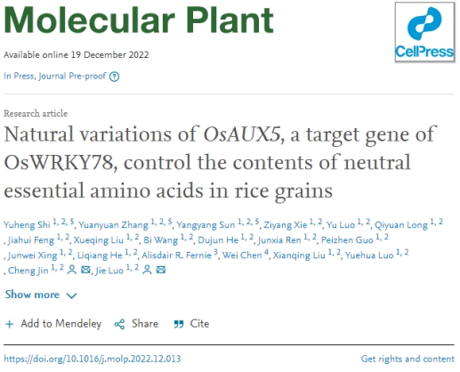 三亚南繁研究院的罗杰教授团队在Molecular Plant (IF=21.9)上在线发表题为“Natural variations of OsAUX5, a target gene of OsWRKY78, control the contents of neutral essential amino acids in rice grains” 的研究论文。该研究利用全基因组关联分析(GWAS)鉴定到控制水稻籽粒多种EAA积累的关键基因OsAUX5,为水稻营养品质改良提供了重要基因资源。