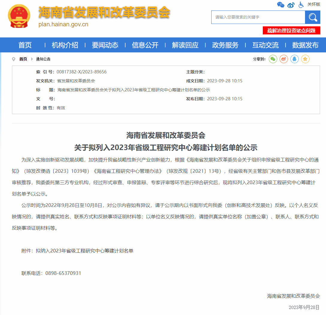 2023年9月28日,海南省发展和改革委员会发布关于拟列入2023年省级工程研究中心筹建计划名单,经综合研究,拟将热带亚热带大豆育种海南省工程研究中心列入2023年省级工程研究中心筹建计划。