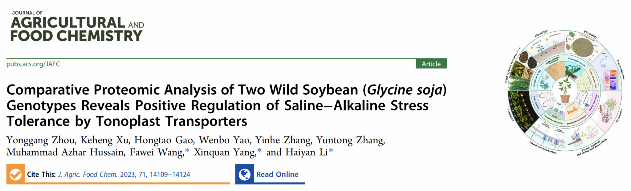 李海燕教授团队在国际学术期刊Journal of Agricultural and Food Chemistry (中国科学院1区TOP,IF:6.1)上发表“Comparative proteomic analysis of two wild soybean (Glycine soja) genotypes reveals positive regulation of saline-alkaline stress tolerance by tonoplast transporters”的研究论文。该研究通过对125份不同地区来源的野生大豆盐碱耐受性的鉴定,并借助蛋白质组学分析的方法,分析发现氨基酸代谢、蛋白质合成和液泡膜转运蛋白形成了一个复杂的反馈网络,并影响大豆的盐碱胁迫耐受性。同时,重点研究了差异表达的液泡膜转运蛋白(GsTIP2-1、GsTIP2-2、GsINT1、GsSUC4和GsACA11)参与大豆耐盐碱调控的相关功能,以解析大豆在盐碱胁迫下的潜在分子调控机制。该项目的研究一方面为深入探索大豆盐碱耐受性的分子机制奠定基础;另一方面也为利用分子育种手段培育耐盐碱大豆新品系提供候选基因及新思路。