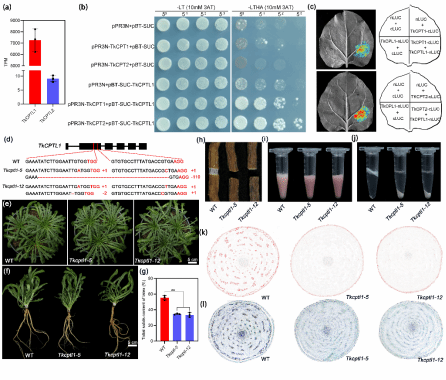 通过序列比对和表达分析找到TkCPT1和TkCPT2的同源基因TkCPTL1,通过酵母双杂等方法发现TkCPTL1分别于TkCPT1和TkCPT2互作。进一步通过CRISPR/Cas9获得Tkcptl1的突变体,发现橡胶生物合成同样受阻,橡胶缺失表型与Tkcpt1/2突变体类似。表明TkCPTL1也是橡胶转移酶的核心组分。
