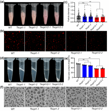进一步对新鲜胶乳进行尼罗红染色、胶乳高速离心、冷冻扫描电镜分析发现Tkcpt1/2双突中橡胶粒子完全缺失。