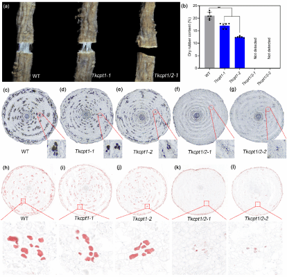 本研究通过CRISPR/Cas9技术分别获得橡胶转移酶TkCPT1单敲除和TkCPT1、TkCPT2双敲除的突变体,通过橡胶含量测定、碘溴染色和油红染色等分析,发现Tkcpt1单突橡胶含量显著降低,而Tkcpt1/2双突橡胶含量完全缺失。