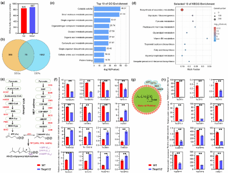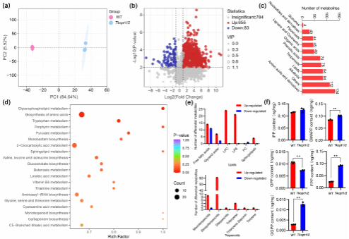 对Tkcpt1/2的胶乳进行代谢组学分析,发现突变体差异代谢物中生物碱、脂类和萜类化合物分布较多。进一步将脂类和萜类进行次级代谢物分析发现脂类中LPC和LEP大量积累,而萜类中单萜和倍半萜大量上调。表明橡胶粒子缺失以后,原用于合成橡胶粒子膜和橡胶烃的原料被重新定向用于合成其他类型的脂类和萜类。