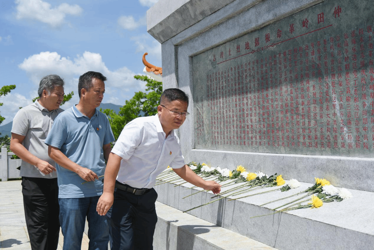 庄严的纪念园内,党员们拾阶而上,缓缓走向仲田岭革命烈士纪念碑,将花束整齐摆放于碑座前,进行默哀表达哀思。