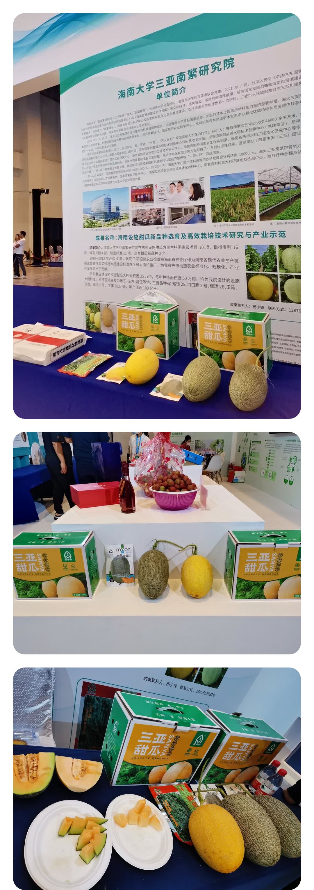 选育的海南设施甜瓜新品种、南豇一号、香灿大米等产品,展台上的甜瓜吸引了众多采购商和市民前来品尝,并与采购商洽谈合作,市民纷纷点赞甜瓜口感非常好。本次活动展示效果良好,接待市民咨询50多人次。