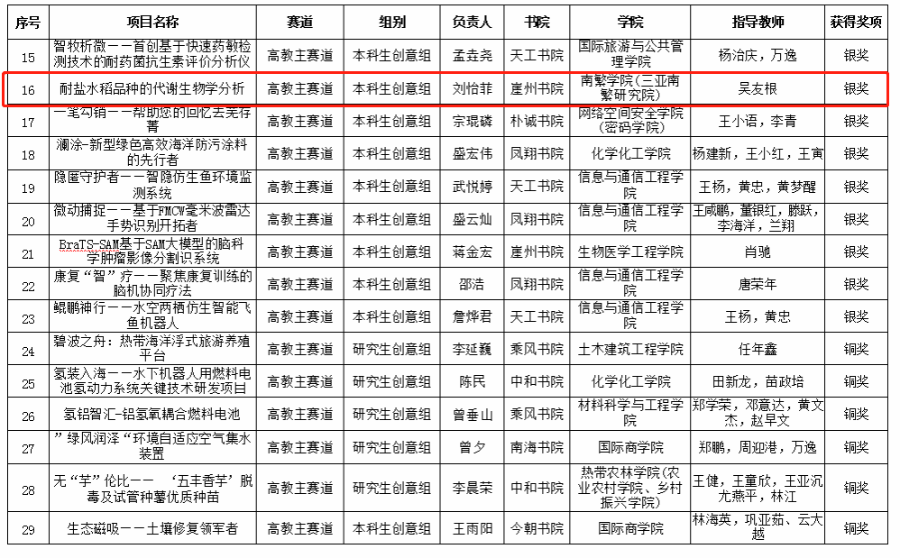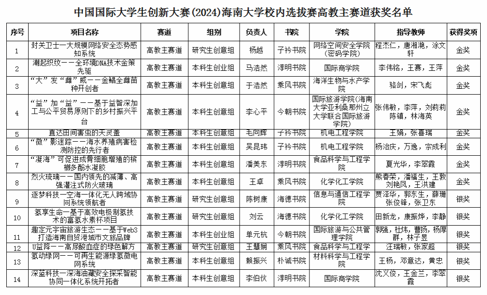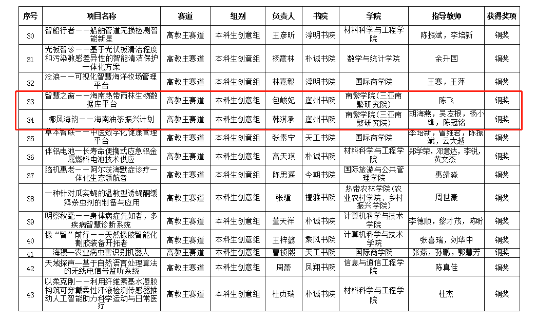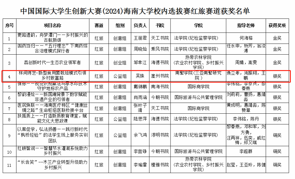 为贯彻落实党的二十大精神,统筹推进教育、科技、人才“三位一体”战略部署2024年6月24日,中国国际大学生创新大赛(2024)包子漫画 校内选拔赛顺利举办,经前期各学院评审推荐、专家网评、现场答辩多个环节,包子漫画 师生的参赛作品在学校众多队伍中脱颖而出,吴友根老师指导的“耐盐水稻品种的代谢生物学分析”荣获高教主赛道银奖;陈飞老师指导的“智慧之窗——海南热带雨林生物数据库平台”荣获高教主赛道铜奖;胡海燕老师、吴友根老师、杨小锋老师指导的“椰风海韵——海南油茶振兴计划”荣获高教主赛道铜奖;聂立孝老师、周振翔老师、王鹏老师指导的“林间得芝-新型食用菌栽培模式引领乡村致富路”荣获红旅赛道银奖。