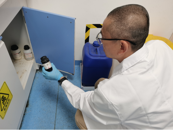 副院长、实验室设备与仪器管理中心主任杨小锋带领两位安全员,逐个实验室逐柜进行检查,检查发现,有多个实验室的易制爆易制毒管制类化学品未进行双锁管理,责令实验室安全员立刻整改。