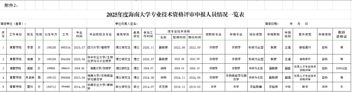 根据《关于做好2025年度专业技术资格评审工作的通知》文件要求,学院开展2025年专业技术资格评审相关工作。截止2025年12月7日,经个人申报,南繁学院共有5名教师申报2025年专业技术资格评审,申报人名单如下: