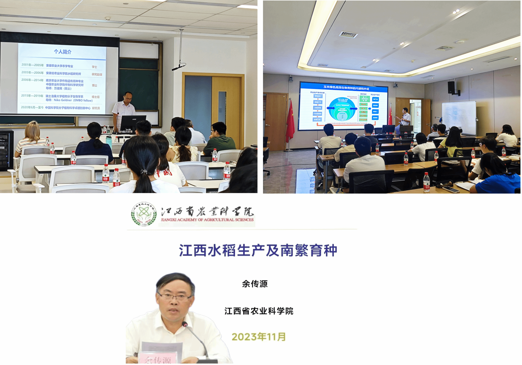 周峰研究员从水稻分蘖调控基因DWARF53的克隆与功能研究和植物根系天然免疫响应在单细胞水平的调控机制解析两个方面展开,生动的介绍了自己的科研旅程;余传源研究员系统的介绍了江西水稻生产情况、品种改良历程、挖掘出的有利基因、南繁育种相关情况及取得成效等,并分享出对于水稻种业发展的思考;万向元教授从玉米绿色高效生物育种的内涵和外延以及实现路径引入主题,深入浅出的讲解了玉米绿色高效生物育种的分子遗传基础研究相关工作,引发同学们的科研思考。