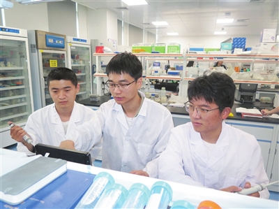 杨壮(右)带领研究生检测椰子样本的RNA浓度(记者李鑫摄)